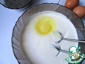 • К сметанной массе добавляем яйца по одному, после каждого взбивая массу миксером на низкой скорости.