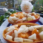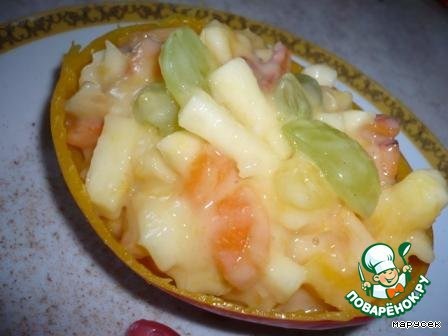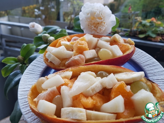 Разрезаем пополам манго. Аккуратно прокручиваем половинки и разнимаем на 2 половинки. Шкурки манго нам пригодятся в качестве пиал для салата, поэтому разнимаем очень аккуратно. Часть мякоти нарезаем в салат кубиками. Вторую часть мякоти манго измельчаем в блендере, добавляем йогурт и приправы по вкусу.