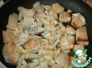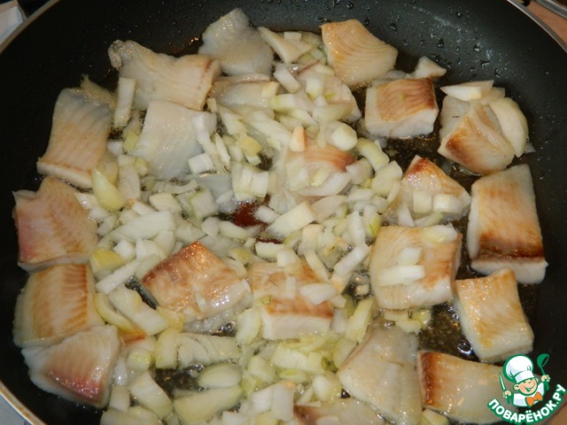 • Рыбное филе порезать на кусочки. Сковороду нагреть, налить масло и выложить рыбу. Обжарить с одной стороны пару минут.
