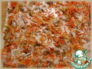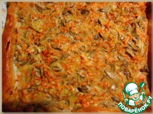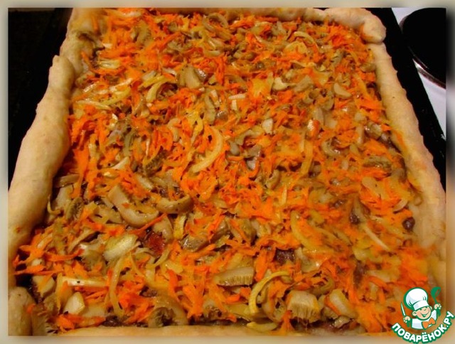 • Ставим опару, замешиваем тесто (вполне подойдёт и готовое!) Пока тесто подходит. Готовим начинку. Сырую морковь трём на крупной тёрке, Лук нарезаем очень тонкими полукольцами, грибы мелкими и тонкими пластинками. Всё перемешиваем, немного солим и перчим, можно добавить майонез, сметану, растительное масло – чтобы начинка стала посочнее.