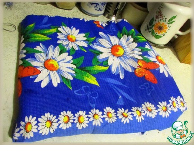 • Укутываем в полотенце чтобы он "созрел" и "подошёл". Если бока пирога суховаты, я сбрызгиваю его ещё горячим из обычного распылителя, который использую для обрызгивания комнатных цветов, перед тем, как укутать пирог в полотенце. Он распарится и становится не таким сухим.