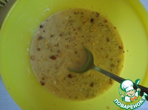 Молоко взбить с яйцом. Посолить. Добавить лук и орехи, достаточно крупно порубленные.
