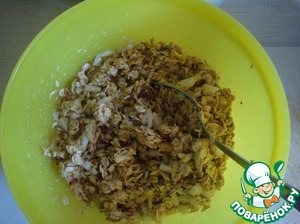 Добавить хлопья, перемешать. Оставить минимум минут на 20, чтобы напитались жидкостью и набухли.