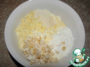• Яблоко мелко нарезать, масло растопить, желтки растереть с сахаром, добавить сметану, манку и молоко. Перемешать все ингредиенты.