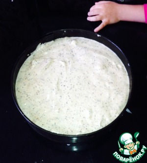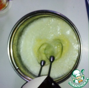 Взбиваем желтки, затем снизив скорость, вливаем воду и подсолнечное масло. Помним, что используем только 4 желтка.