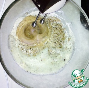 Затем выливаем желтковую смесь в муку и все вместе взбиваем.