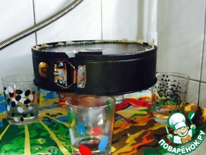 Выпеченный корж остужаем в форме, поставив её вверх дном на четыре стакана. Это делается для того, чтобы середина не просела. Извините за задний план, но это единственное место вне досягаемости страждущих в лице моей дочки. С бисквитом можно работать не раньше, чем через 6 часов. Время приготовления я указала без учёта "отдыха" бисквита. Перевёрнуто можно сразу после остывания, а перед тем, как вынуть, провести аккуратно ножом вдоль бортика, чтобы бока отстали от формы.