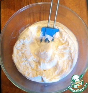 Аккуратно вмешиваем белки в желтково-мучную массу, движениями снизу вверх. Делаем это очень осторожно, долго не мешаем.