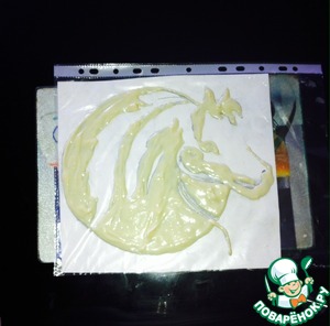 Вставила картинку в файл и обвела всё, что нужно растопленным белым шоколадом. В холодильнике картинка быстро застывает и легко снимается с файла.