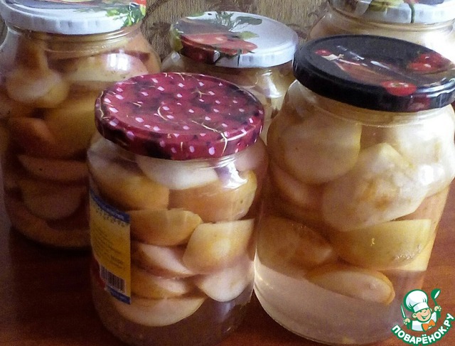 Кладем мед в кастрюлю и сливаем воду с яблок. Мёд растает, закипит, заливаем яблоки, закатываем и в тепло.