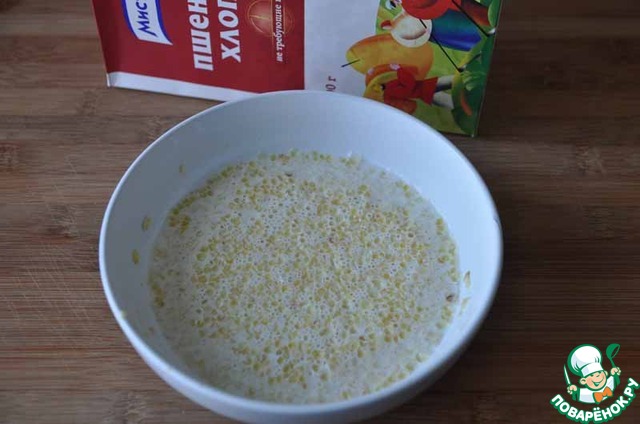Берём хлопья и заливаем горячим молоком в соотношении 1 к 1, оставляем на 3 минуты для набухания.
