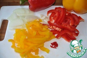 • Овощи моем, чистим. Перцы нарезаем тонкими полосками, лук полукольцами. Чеснок и перец чили нарезаем мелко.
