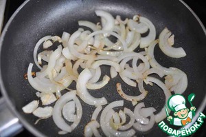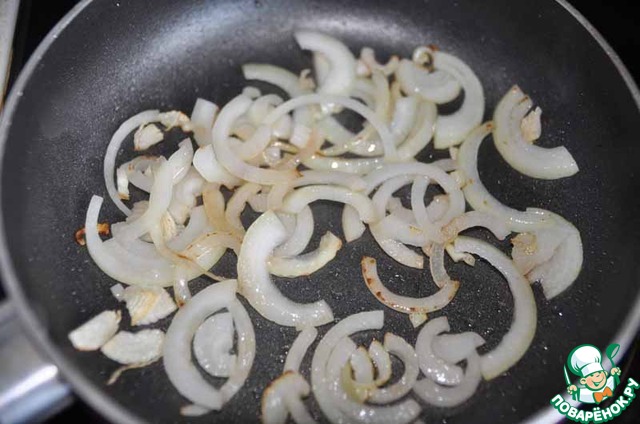 • Берём сковороду и на оливковом масле до румяности обжариваем порезанные лук и чеснок.