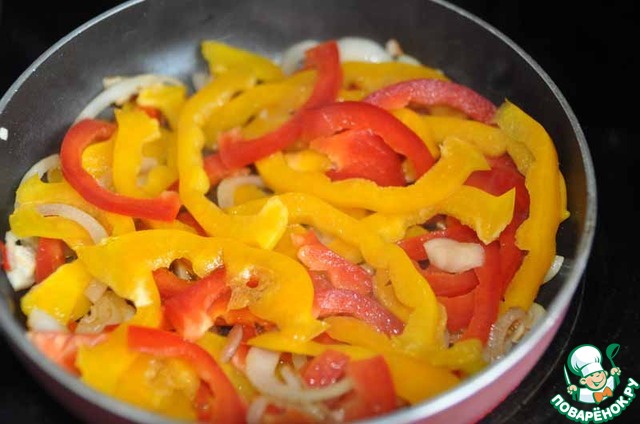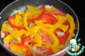 • Кладём порезанные болгарские перцы и перец чили, всё обжариваем помешивая 6 минут. Перец не должен стать слишком мягким.