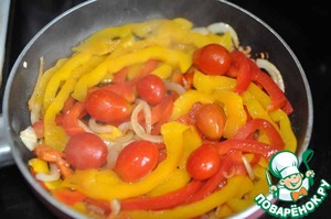 • Кладём помидоры черри, обжариваем ещё 2 минуты.
