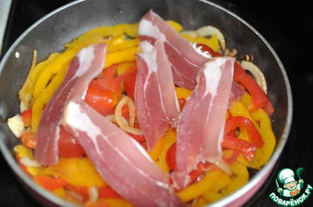 • Кладём тонкие полоски сыро-копчёного бекона. Если у вас есть чоризо, то добавьте её.