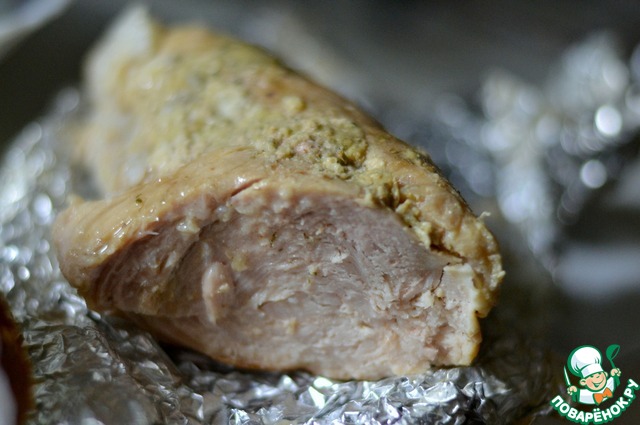 В оригинале рецепта написано, что разворачивать надо непосредственно перед подачей на стол. Но я разворачиваю (не до конца!) сразу, проверяю ножом на готовность. Если всё нормально, а как правило, за это время свинина вполне готова, то поливаю сверху образовавшимся соком, и... -