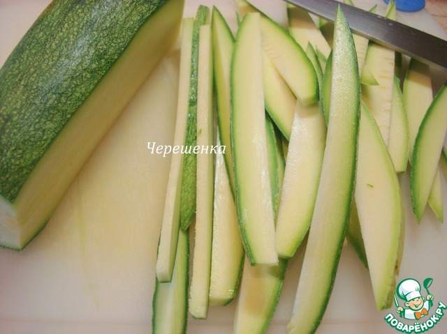 Цукини нарезать тонкими длинными полосками, толщиной 3мм.
