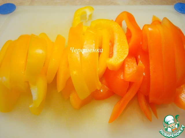 Болгарский перец очистить от семян и нарезать крупной соломкой.