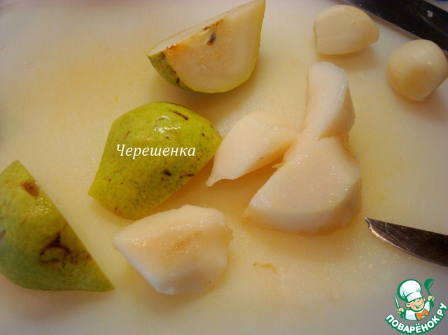 Сделаем маринад для овощей. Для этого возьмем грушу, очистим ее от кожуры и семечек. Чеснок очистить.