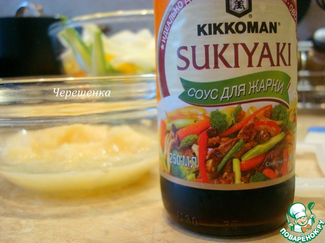 - Соевый соус (2 ст.л. соуса – маринада Teriyaki Kikkoman, 2 ст.л. соуса для жарки Sukiyaki Kikkoman, 1 ст.л. соевого соуса натурально сваренного Kikkoman ) — 5 ст. л.