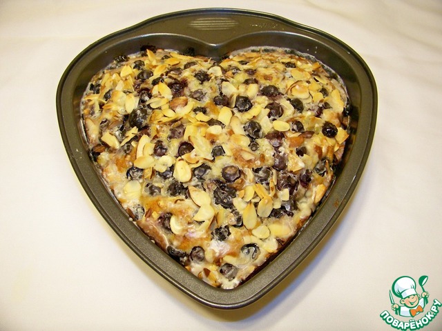 Сверху распределить оставшуюся смородину (если есть миндальные лепестки, то ими нужно посыпать сверху смородину) и отправить тесто в разогретую духовку до 190 градусов на 40 минут.