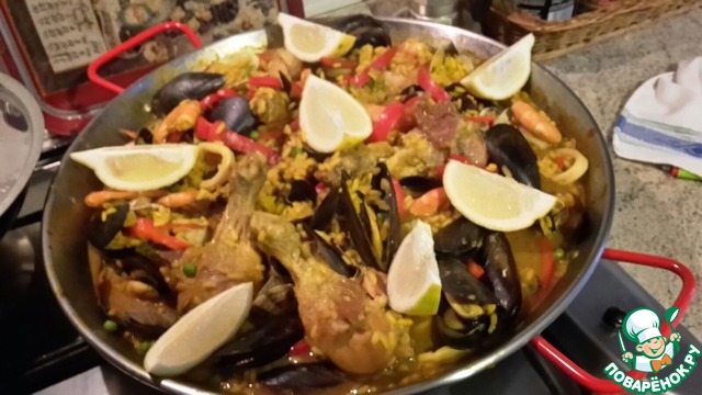 Далее приводится рецепт паэльи с морепродуктами и мясом – Paella al estilo mar y tierra (паэлья в стиле «Море и земля» -