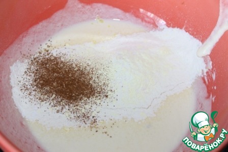 Добавляем муку, соль, разрыхлитель и корицу, перемешиваем.