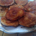 Окунаем хорошенько яблочное кольцо в тесто и обжариваем на небольшом количестве растительного масла с двух сторон до золотистой корочки (румянятся оладьи быстро, смотрите, чтобы не подгорели).