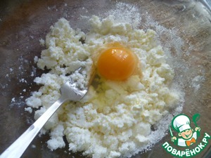 Для этого в творог насыпаем 4 ст. л. сахара и добавляем 1 яйцо. -