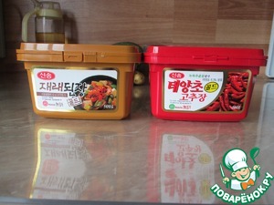В коричневой коробочке соевая паста "Дендян", в красной острая перцовая паста "Кочудян". Кстати, если вы не любите Кочудян, то можете просто добавить красный жгучий перец по вкусу