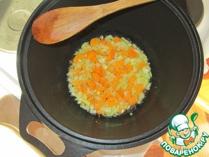 Итак, нальем растительно масло в казан, добавим лук и морковь, обжарим -