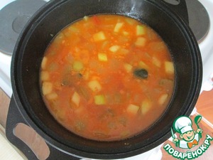 Наливаем кипяченую воду. Объем воды варьируется от ваших предпочтений. Любите гуще - покройте на 2-3 пальца. Пожиже, налейте больше. Мы любим так. Доведите до кипения и варите до готовности овощей.