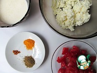 Адыгейский сыр измельчаем в крошку пальцами или с помощью блендера. Важно, чтобы сыр был измельчен как можно мельче, от этого условия напрямую будет зависеть его сходство с омлетом. Режем кубиками помидоры, сметану смешиваем с молоком и гранулированным чесноком.