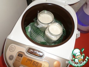 Смешиваем молоко и йогурт. Я добавила еще немного сахара. Разливаем по баночкам. Крышечек у меня не было, поэтому обернула сверху пищевой пленкой. На дно кладем полотенце. Заливаем в чашу мультиварки теплую воду до уровня молока в баночках. Выбираем программу Мультиповар, ставим температуру 40 градусов и время приготовления 8 часов.