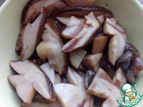 Пока тесто в холодильнике - готовим начинку. Грибы (у меня белые, можно шампиньоны)нарезать пластинками. Я их отварила (10 мин). Несколько грибов отложить для украшения.