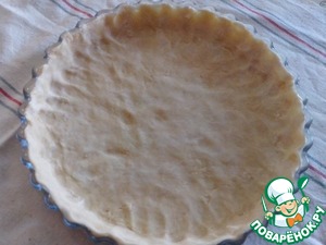 Достать тесто из холодильника, выложить в смазанную форму для выпекания с бортиками (d= 27 см) и аккуратно пальцами разровнять тесто по всей форме, не забывая про бортики.