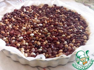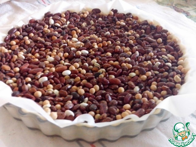 Накрыть пергаментом, насыпать сухой горох (или фасоль) и выпекать 10- 15 минут при 180 градусах. Пергамент с горохом удалить и выпекать ещё 10 минут.