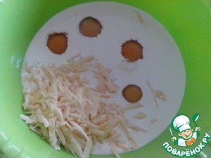 В глубокой миске разболтать яйца со сливками, добавить натёртый на крупной тёрке сыр.