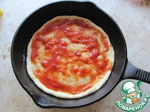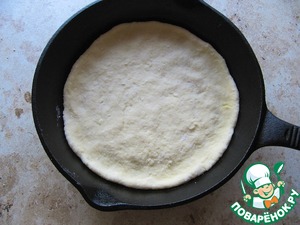 Тесто разделить на 2 части (хватит на 2 порции, диаметр сковородки - 20 см). Дно сковородки подпылить мукой, тесто раскатать, выложить в сковродку.