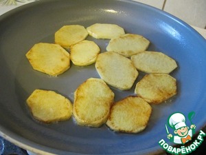 Картофель нарезать кругляшками, посолить и обжарить на растительном масле почти до готовности.
