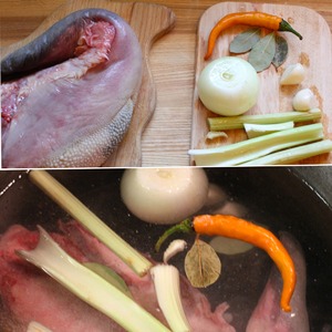 И так, для начала язык нужно сварить. Для этого хорошо его помоем, в кастрюлю кладем язык, стебли сельдерея, перец чили, пару лавровых листиков, чеснок, лук. Заливаем холодной водой. Варим на среднем огне 2 часа, не солим.