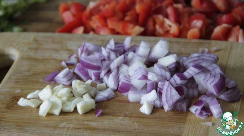 Нарезать мелким кубиком очищенные сладкий лук и чеснок.