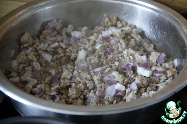 Затем аккуратно отодвинуть в сторону "схватившийся фарш" и продолжать выкладывать остальной. Подождать, пока он "схватится", а после этого можно помешивать всю порцию и жарить до румяности фарша (ок. 10-12 мин.), помешивая.