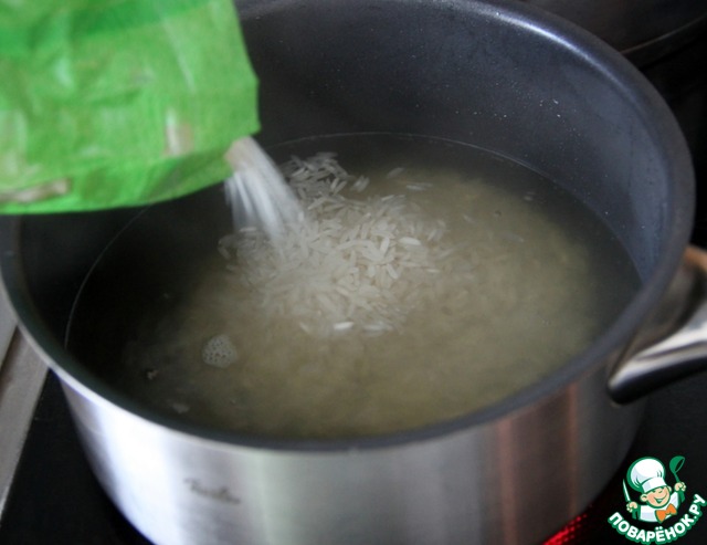 Оставшиеся 300 мл довести отдельно в кастрюльке до кипения и добавить рис. Варить до готовности риса.