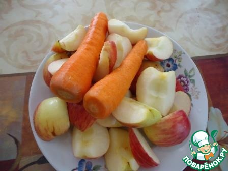 • Яблоки и морковь моем, чистим, из яблок удаляем семена и трём морковь на мелкой тёрке, яблоки на крупной. Я яблоки не чистила, просто мякоть тёрла а кожуру выбрасывала. У меня были мелкие яблоки, так что соотношение может быть немного другим, чем указано в ингредиентах, это не принципиально.