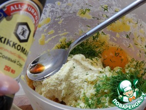 Готовим тесто. Блендером измельчаем картофель, добавляем половину сметаны, яйцо, кукурузную муку, порезанный укроп и соевый соус.
