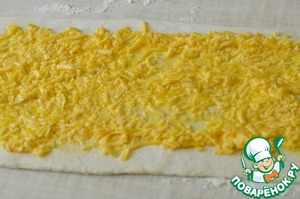 Выложить на прямоугольник сырную начинку, свернуть длинный рулет. -