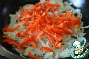 В сковороде разогреть масло. Обжарить лук до прозрачности. Затем добавить перец, обжаривать еще 3 минуты. -