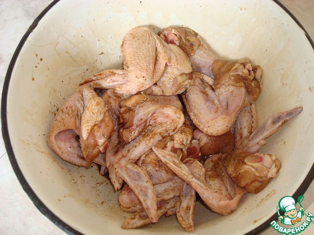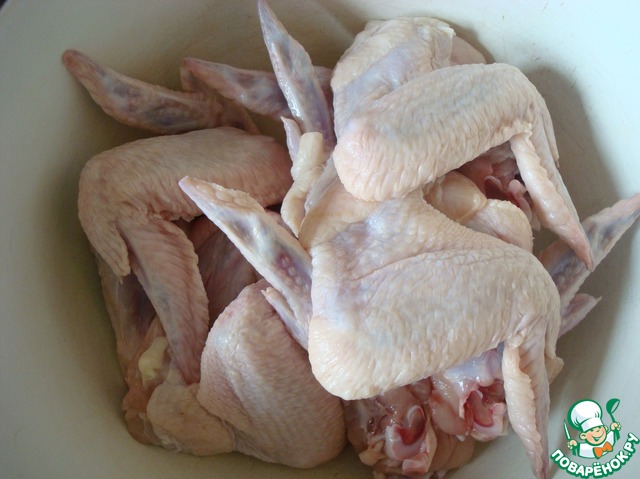 Крылышки разморозить, хорошо промыть, удаляя оставшиеся перья.